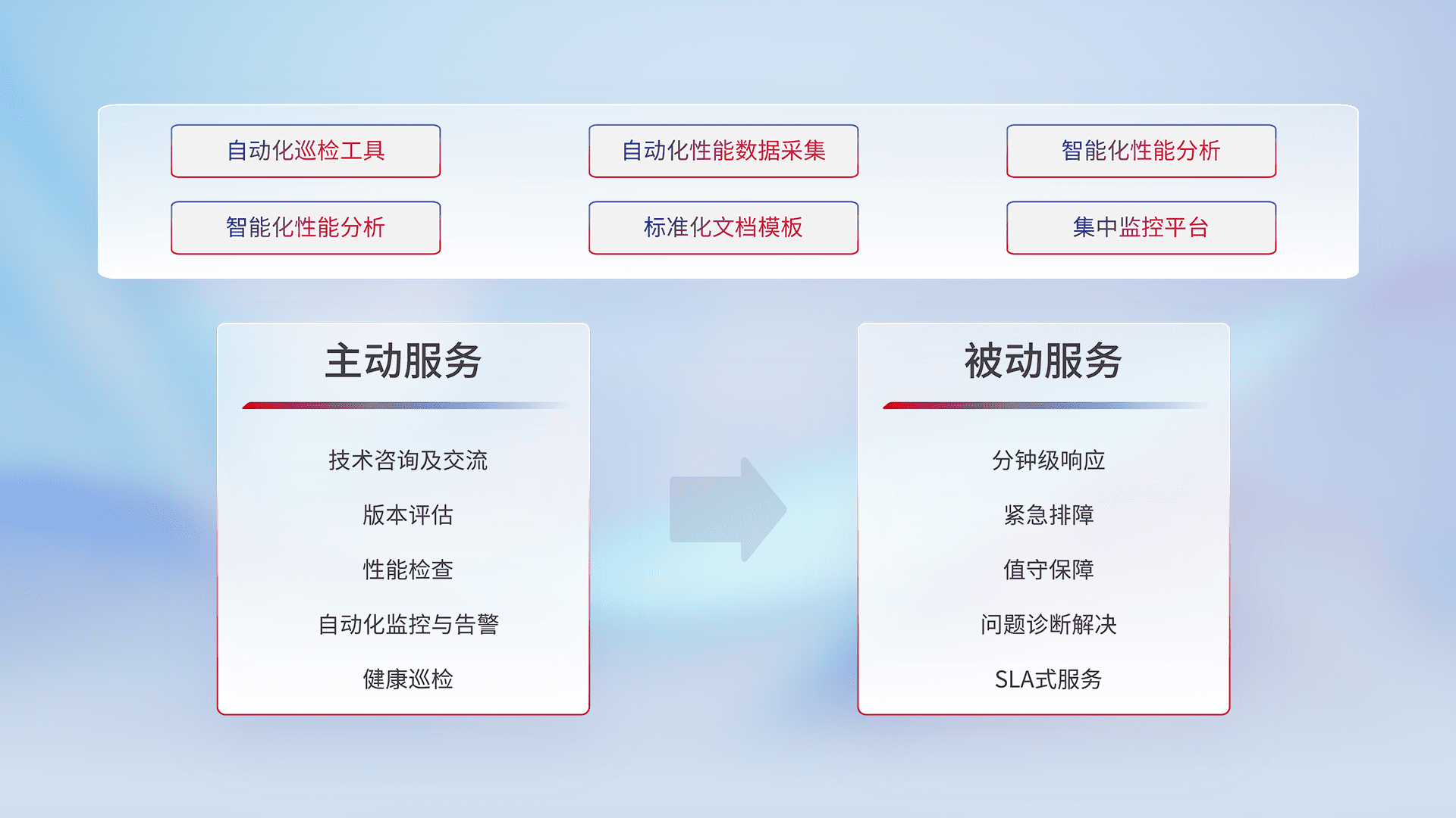 智能化工具和标准化文档,,保障服务质量,,,提供主动服务(包含技术咨询、、、版本评估、、、性能检查、、、自动化监控与告警、、、健康巡检)和被动服务包含(分钟级响应、、、紧急排障、、、值守保障、、、、问题诊断解决、、、SLA服务)。。
